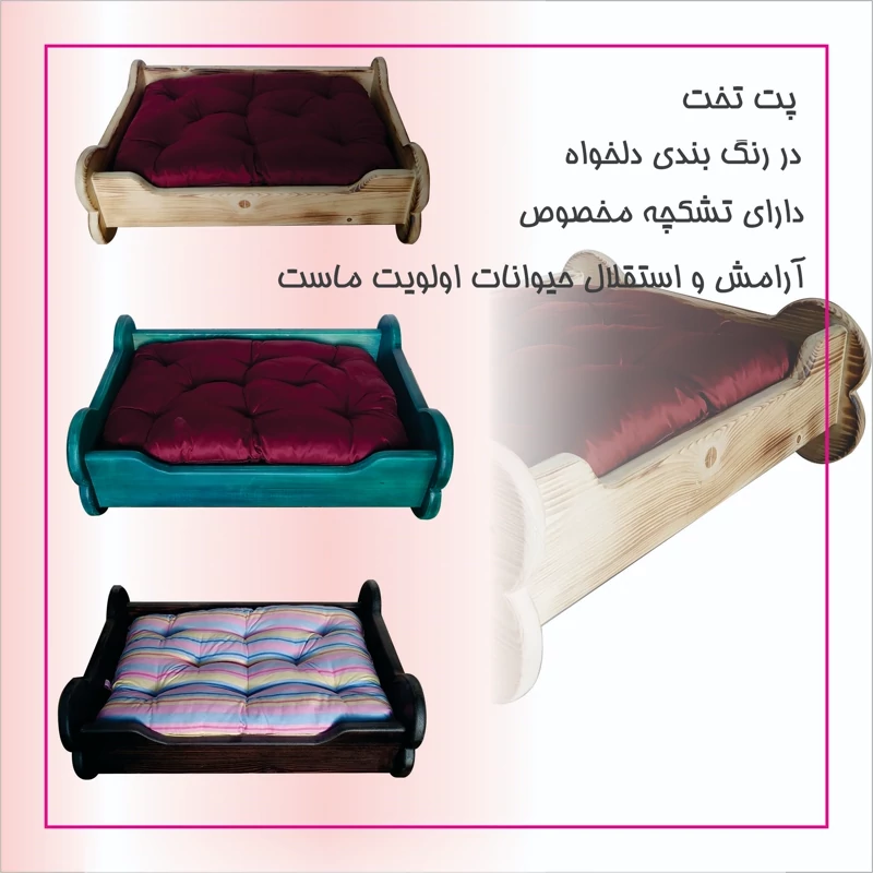 پت تخت محلی مناسب برای استراحت و آرامش حیوانات خانگی- ساخته شده از چوب درجه یک- دارای تشکچه مناسب- در رنگهای دلخواه شما